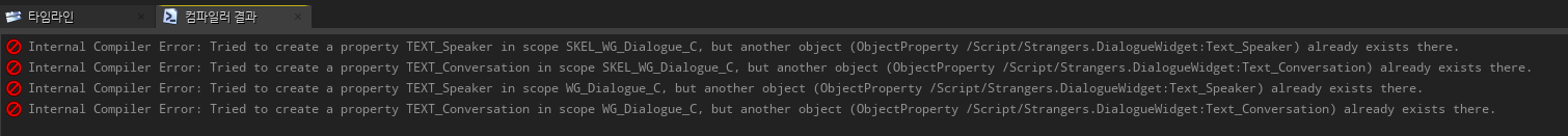 이 글에서 해결점을 찾을 수 있었다. 나와 똑같은 문제를 겪고 있는 사람에게 어떤 분이 감사하게도 답글을 달아주셨다. "UWidget 클래스 (C++ )에 선언된 것과 같은 프로퍼티가 이미 있는 것 같습니다. 버전4.21부터 블루프린트 변수와 C++의 변수가 동일하기에 클래스 이름이 충돌합니다."
