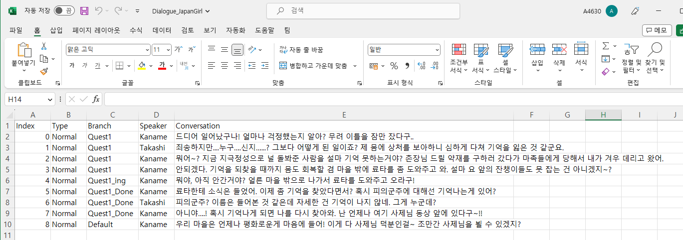 - 각 액터 별 대화 정보는 CSV파일로 관리하고 "Branch"로 대화를 구분하여 원하는 대화를 출력할 수 있도록 구현.