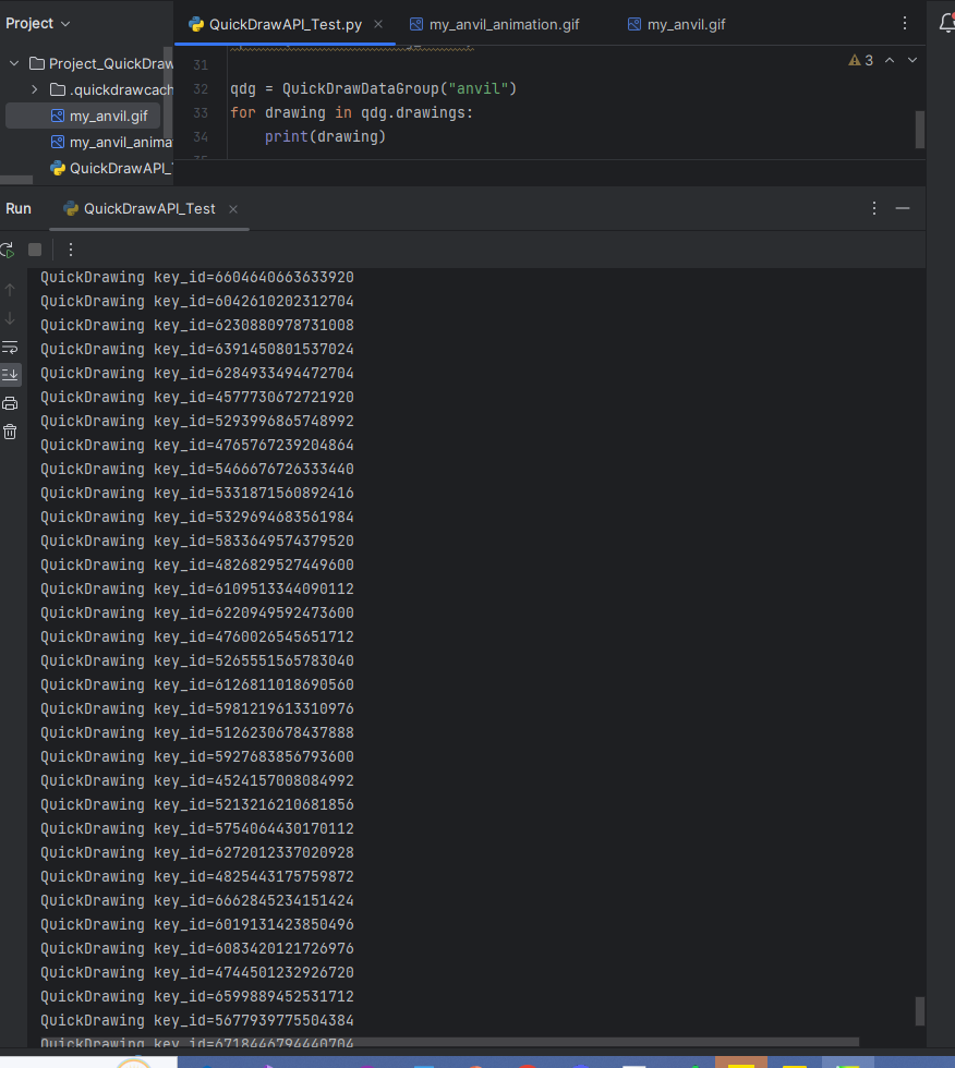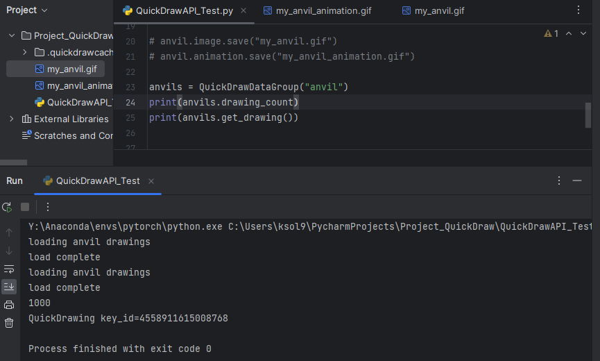 2. 설치한 라이브러리를 사용하는 방법의 예시를 소개하겠습니다. 자세한 내용은 API설명서를 참조하시면 됩니다. QuckDrawData를 사용하여 QuickDraw 데이터를 열고 '모루'의 Drawing을 가져오겠습니다.