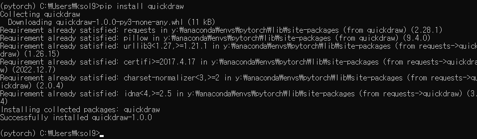 1. 먼저 퀵드로우의 파이썬 라이브러리를 pip를 이용해 설치합니다.