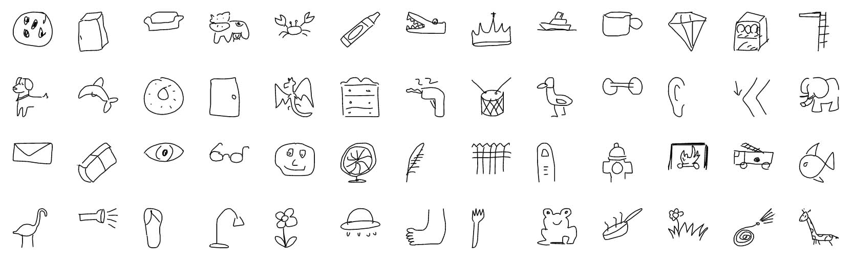 Quick Draw는 신경망이 위와 같은 낙서를 인식하도록 훈련시키는 드로잉 게임입니다. quickdraw 는 Quick Draw 데이터에 접근하기 위한 파이썬 API로, 필요에 따라 데이터 파일을 다운로드하고 로컬로 캐시하여 사용할 수 있도록 해석해줍니다.