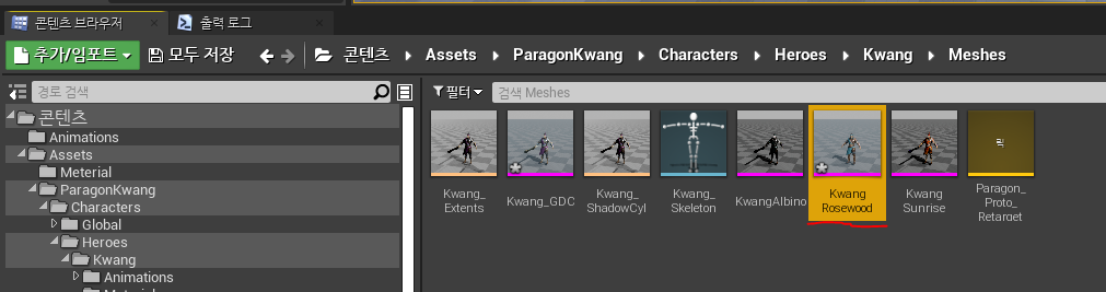 보통의 경우 캐릭터 스켈레탈 메쉬를 프로젝트에 임포트하면 무기는 붙어있지 않은 것이 일반적이다. 하지만 특히 언리얼의 혜자 무료에셋인 Paragon 시리즈의 캐릭터에셋들을 보면 스켈레탈 메쉬에 무기가 함께 붙어있는 것을 확인할 수 있다. 아마 캐릭터 애니메이션에 무기 애니메이션도 함께 연결하고 싶어서 묶지 않았을까 싶지만 지금 내가 만드는 게임의 경우 무기를 유동적으로 교체하기 위해 기본으로 달려있는 무기를 떼어야 한다.