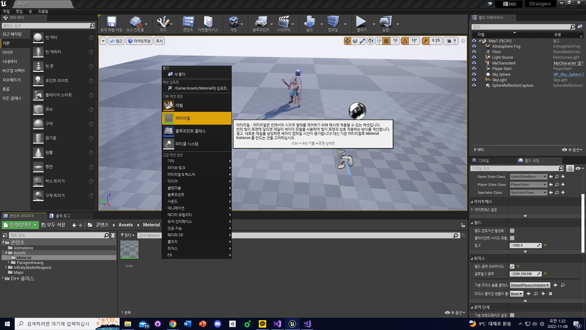 그렇다면 무기 머터리얼은 어떻게 투명으로 바꿀 수 있을까? 일단 원하는 위치에 머터리얼을 하나 생성해준다.