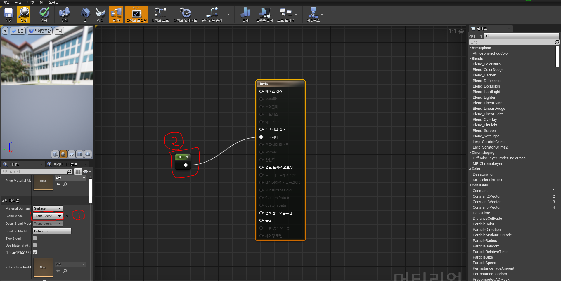 2. 필드에 우클릭 후 constant를 검색해 그림과 같은 노드를 추가 후 오파시티 항목에 연결해준다.