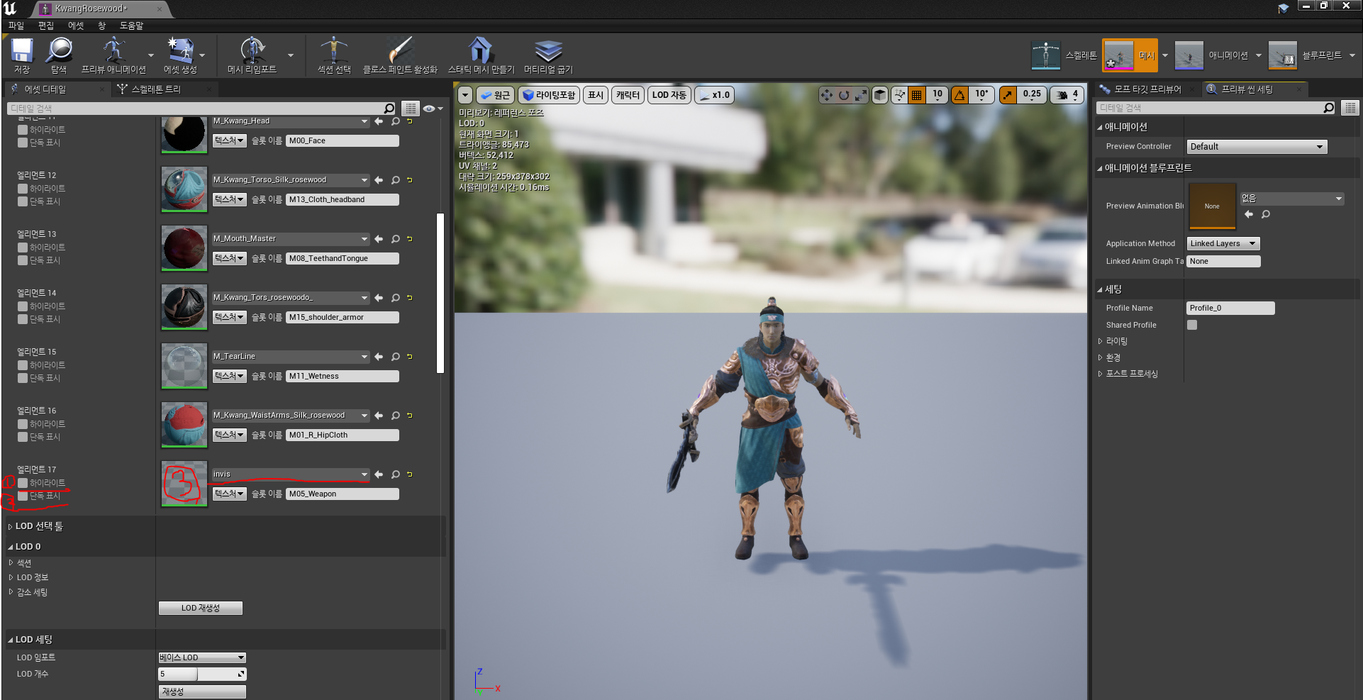 1번과 2번(하이라이트, 단독표시)를 체크해가며 무기 머터리얼이 적용된 엘리먼트를 찾는다. 찾은 후 3번 머터리얼에 방금 만든 invis 메쉬를 적용시켜주면 끝이다. 드디어 내가 설정한 무기가 가려지지 않고 적용된다!!