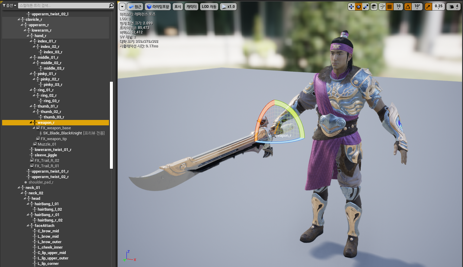 사실 구글링을 열심히 해보고 아는 지식으로 여러가지 시도도 해봤지만 칼자체를 깔끔하게 캐릭터에서 떼어낼 방법은 찾지 못했다. 사실 어찌보면 당연한게 캐릭터와 '한 몸'인 상태로도 볼 수 있기에 만약 우리가 캐릭터의 팔 한쪽만 떼어내고 싶다고 뗄 수 없는 것과 당연한 논리이다. (물론 3D Max나 Maya, Blender 같은 프로그램으로 뗄 수 있을 것으로 추정한다.) 우리는 좀 더 쉽고 빠른 트릭으로 무기를 제거할 수 있다. 다행히 저 한 몸을 색칠하는 기능을 하는 머터리얼은 여러 부위로 나뉘어져 있다. 그 중 무기 머터리얼을 투명으로 바꿔주면 무기가 존재함에도 보이지 않아 제거된 것과 같은 효과를 낼 수 있다.