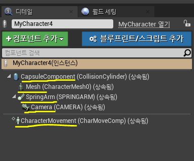 한가지 궁금한 점은 GetMesh()가 거의 MyCharacter를 불러오는 기능처럼 쓰이는데 GetMesh는 반환값도 스켈레탈 메쉬포인터이고, 스켈레탈 메쉬는 캐릭터 클래스에 딸린 하위컴포넌트일 뿐인데 왜 캐릭터에 에님 블루프린트를 적용시킬때나 위와 같이 상위클래스에 연결시킬때 쓰이는걸까...? 스켈레탈 메쉬 만능설.. 공부가 더 필요하다. 에님 블프나 소켓이 스켈레탈 메쉬와 관련이 있다는 건 알지만.. 유니티에 너무 익숙해져있어서 그런가 자꾸 직관적인 해답을 찾게된다.