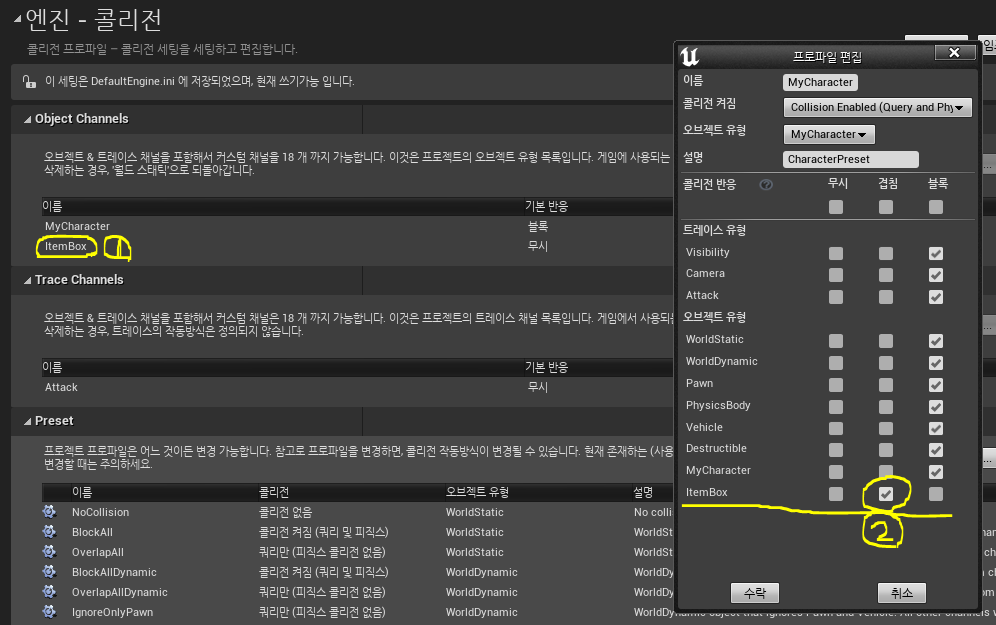 ItemBox라는 이름으로 오브젝트 체널을 하나 생성한 후 프리셋도 하나 생성해서 기본 반응은 무시, MyCharacter와의 콜리전 반응만 겹침으로 설정해준다. 캐릭터의 ItemBox에도 마찬가지로 겹침 반응을 설정해야 한다. (콜리전 켜짐 메뉴의 값은 Query Only로 지정하고 오브젝트 유형은 ItemBox로 지정해준다. )