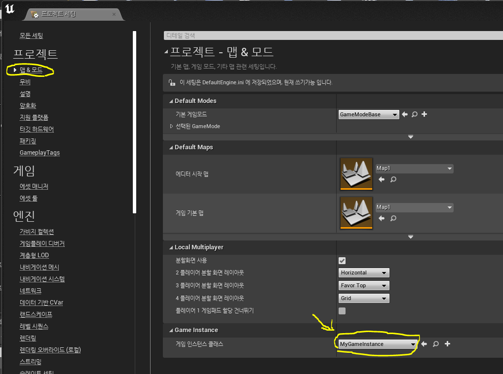 엑셀에 저장돼 있는 캐릭터의 스탯 데이터 테이블을 언리얼 엔진에 불러들여보자. 캐릭터 스탯 데이터는 게임의 기반을 이루는 변하지 않는 데이터이므로 보통 게임 앱이 초기화될 때 불러들인다. 언리얼 엔진은 게임 앱을 관리하기 위한 용도로 GameInstance라는 언리얼 오브젝트를 제공한다. 이 인스턴스가 캐릭터의 스탯을 관리하도록 설계하면 게임 앱이 초기화될 때 캐릭터 스탯 데이터를 불러들이고, 앱이 종료할 때까지 스탯 데이터는 보존된다. GameInstance 클래스를 부모로 하는 클래스를 제작 후 프로젝트 세팅의 맵&모드로 들어가서 GameInstance항목을 우리가 만든 것으로 바꿔주면 게임 앱을 관리할 수 있다.