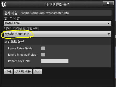 이제 에디터에서 임포트를 클릭하고 아까 만들어둔 CSV파일을 선택한다. 그러면 데이터테이블 옵션 다이얼로그가 생성되는데, 데이터 테이블 행 유형 선택의 드롭다운 목록에서 우리가 선언한 MyCharacterData로 설정하자.