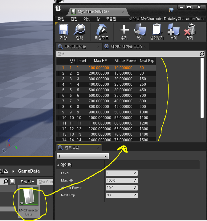 위에서 임포트한 CSV파일을 가져와 MyCharacterTable에 저장시켜준다.