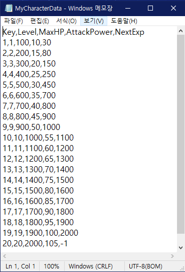 다음으로 원하는 캐릭터 스탯 데이터를 엑셀에 작성 후 CSV파일 형식으로 저장해준다.