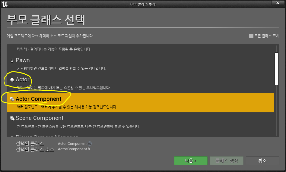 커뮤니티에서 영어로 설명한 내용중 와닿았던 것이 있는데 대충 액터가 아니라 액터 하위에 컴포넌트를 추가하고 싶은 것이냐? 이런 물음이었다. 그러고보니 C++클래스를 추가할 때 항상 Actor 바로 밑에 ActorComponent가 있다는 것을 알아챘고, 내가 ActorComponent가 아닌 Actor를 생성했기에 오류가 발생한 것이었다.
