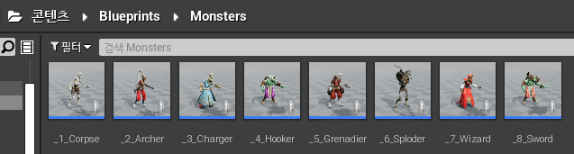 CSV파일로 몬스터 종류와 그에 따른 이동속도, 공격력, 잡을 시 획득 경험치 등을 다르게 적용시켰습니다. 각각의 몬스터는 블루프린트를 활용해 다른 스태틱메쉬와 ID를 적용시켜주었고, 각각의 몬스터에 부착되어있는 MonsterStatComponent에서 ID(블루프린트에서 받아온)를 이용해 각 스탯을 적용시켜주도록 했습니다.