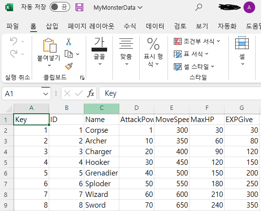 플레이어와 몬스터의 스탯정보를 기획하고 벨런싱 해 엑셀에 정리하였고, 이를 CSV로 저장 후 언리얼에 임포트 했습니다. 또한 각각의 열 데이터에 맞게 구조체를 만들어 DataTable을 이용해 불러오도록 하였습니다.