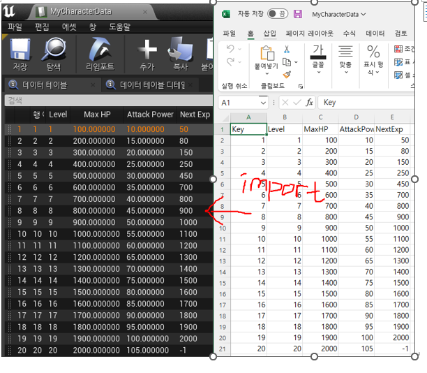 플레이어와 몬스터의 스탯정보를 기획하고 벨런싱 해 엑셀에 정리하였고, 이를 CSV로 저장 후 언리얼에 임포트 했습니다. 또한 각각의 열 데이터에 맞게 구조체를 만들어 DataTable을 이용해 불러오도록 하였습니다.