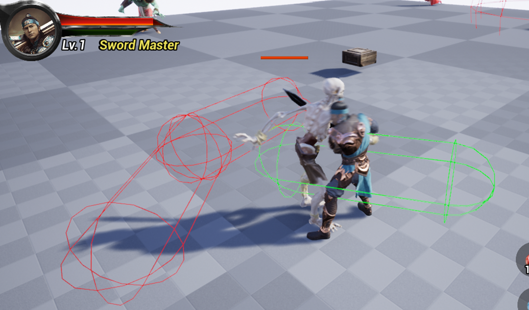 콜리전 채널과 프리셋을 추가하고, SweepSingleByChannel()를 사용해 충돌여부 확인하였습니다. 구 모양이 사거리만큼 쓸고 지나가면서 오브젝트 감지하는 원리입니다. 쉽게 확인할 수 있도록 에디터 모드에서 캡슐모양으로 충돌 범위와 충돌여부 드로잉 디버깅라인을 그리고 공격 성공 시 초록색, 실패 시 빨간색으로 공격 범위가 나타나도록 구현하였습니다.