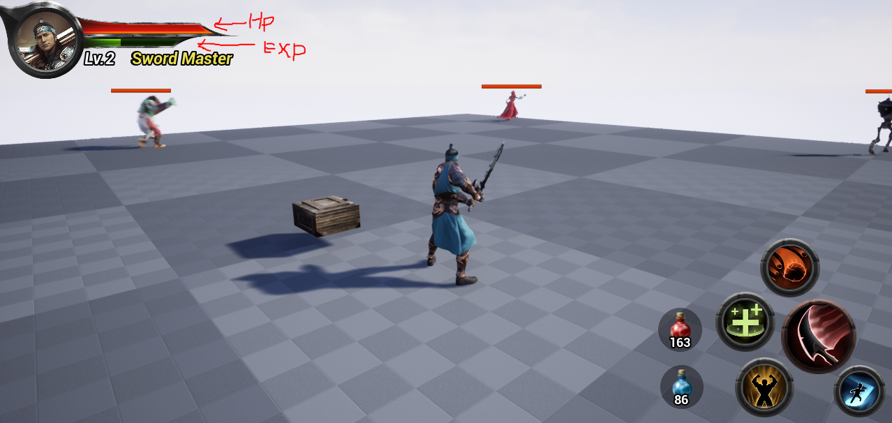 캐릭터 UI를 스탯 데이터와 WidgetUI를 활용해 제작하였습니다. 경험치, HP, 레벨이 실시간으로 변화하는 모습을 볼 수 있습니다. 스킬 쿨타임, 포션과 ProgressBar의 보간은 향후 구현할 예정입니다.