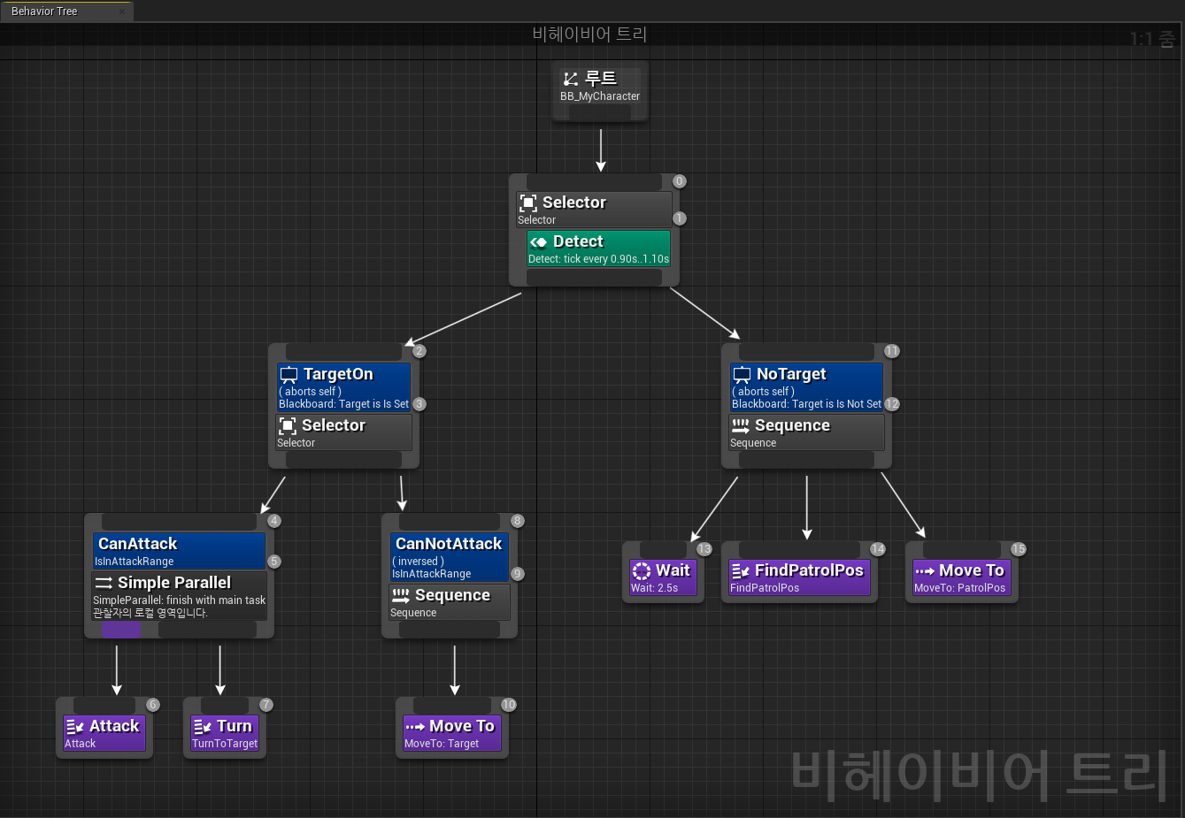 언리얼에서 제공하는 비헤이비어 트리(Behavior Tree)모델을 활용해 몬스터 AI를 제작하였습니다.