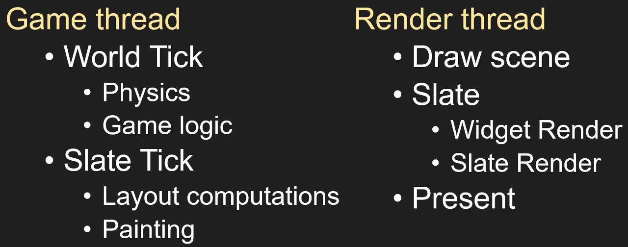 Game Thread(게임 스레드)에서 슬레이트틱은 프레임당 두 번 위젯 트리를 통과합니다.