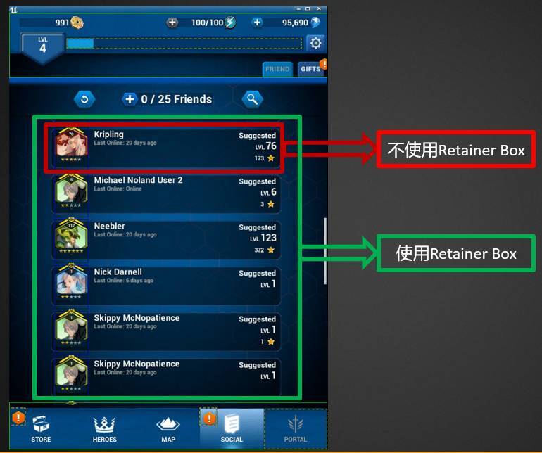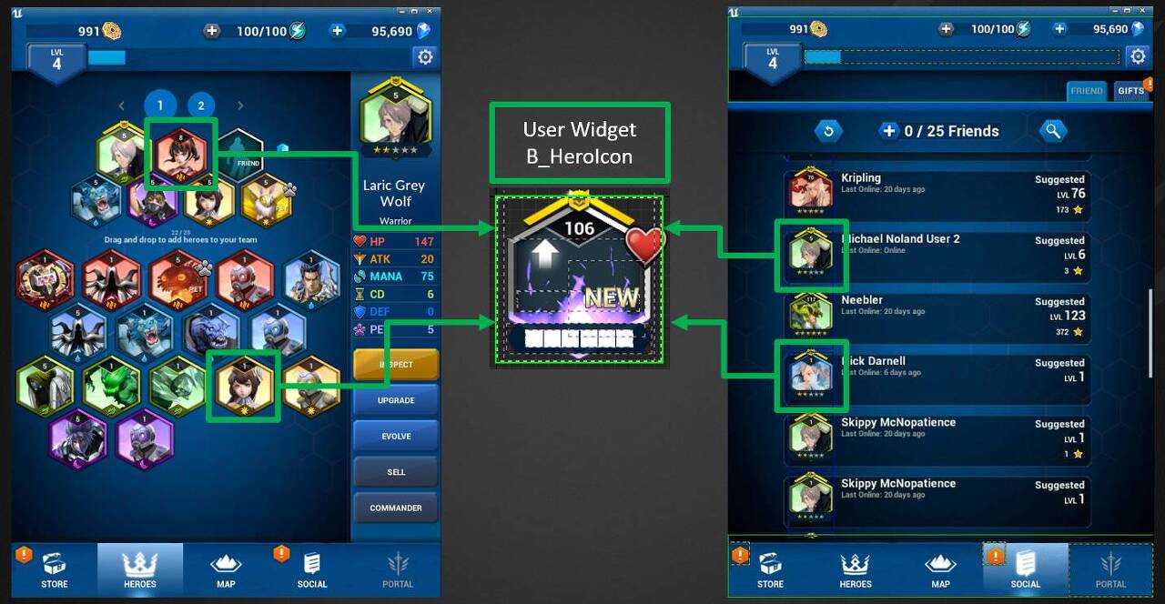 다음 그림은 또 다른 상황을 보여줍니다. UserWidget B_HeroIcon은 HEROS 및 SOCIAL과 같은 여러 주요 인터페이스에서 반복적으로 사용됩니다. 배틀 브레이커는 UI가 많은 모바일 게임이기 때문에 비디오 메모리를 많이 차지할 메인 인터페이스의 모두에 Retainer Box를 할당하기가 어렵습니다. 물론, 우리는 각 B_HeroIcon에 대해 Retainer Box를 만들고 싶지는 않습니다.