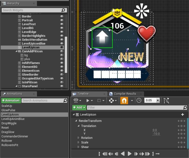 위 그림의 레벨업 아이콘은 평소에는 숨겨져 있으며 캐릭터가 업그레이드 될 때 표시됩니다. 레벨업 Anim은 위젯의 위치를 변경하여 애니메이션 효과를 실행합니다. 이 이미지를 렌더링 할 때 위치가 변경되었기 때문에 Invalidation Box가 프레임마다 전체 위젯 트리의 캐시를 다시 계산해야 하고, 이렇게 되면 성능이 상대적으로 낮아지게 됩니다. 성능을 향상시키기 위해 이 위젯을 Volatile(휘발성)으로 설정할 수 있습니다.