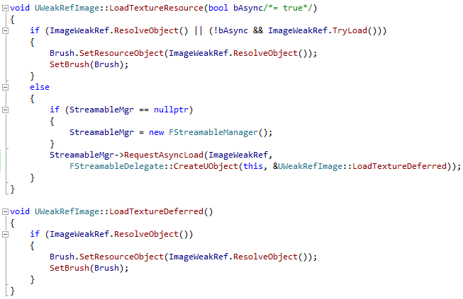 코드 로직상으로 independent 텍스처와 merged 텍스처 사이를 전환해야 하는 경우 Manager Class에서 independent 텍스처(UTexture2D)와 merged 텍스처 리소스(UPaperSprite)를 초기화하고 FslateBrush를 생성한 다음 SetResourceObject를 통해 리소스를 FslateBrush로 설정합니다. 그러면 스위치 변수를 통해 UImage::SetBrush로 전달되는 파라미터를 제어할 수 있습니다.