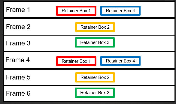 Retainer Box의 Phase Count를 전체적으로 고려해야 합니다. 예를 들어, 다음 그림은 Retainer Box가 3프레임마다 업데이트 되고 프레임 0에서 업데이트 되는 것을 보여줍니다. :