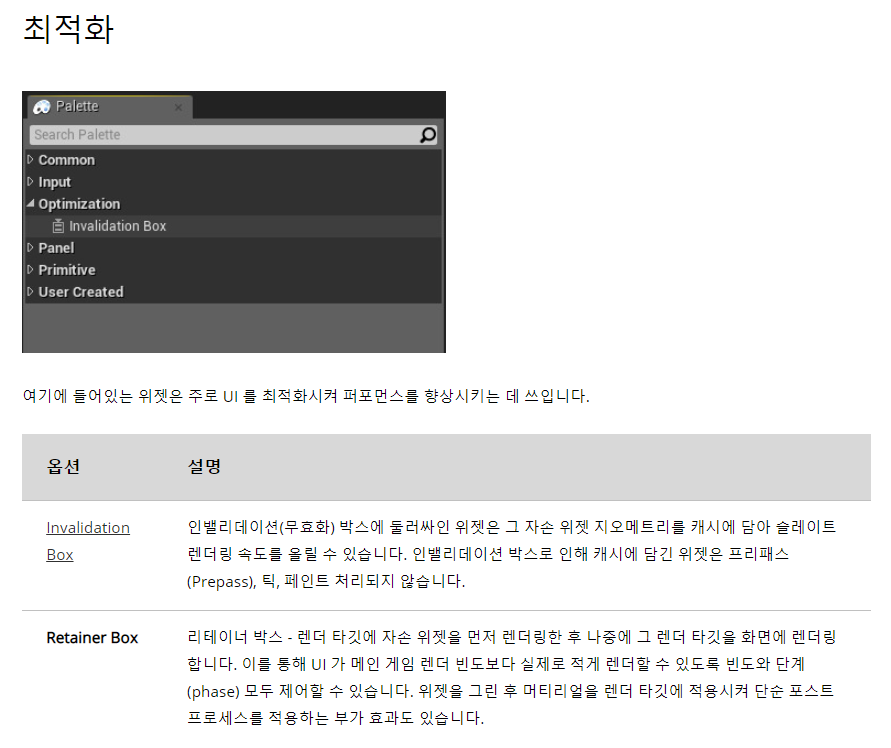 대부분의 UI 최적화 작업(Invalidation Box, Retain Box)는 프로젝트 후반(기본 UI 개발 완료 후)에 수행됩니다. UE4는 풍부한 기능과 디버깅 도구를 제공하며, 이러한 기능을 마스터하면 개발자가 고성능 UI를 달성하는 데 도움이 될 수 있습니다.