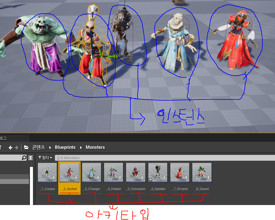간단히 설명하자면 빨간색의 아키타입들은 내가 만든 C++클래스인 MyMonster에서 파생한 블루프린트 클래스이고 이를 각각 맵에 배치한것이 파란색의 인스턴스들이다. 코드에서 이들이 소유하고 있는 변수 두개를 각각 인스턴스/아키타입 에서만 볼수있게 지정자를 변경해보았다.
