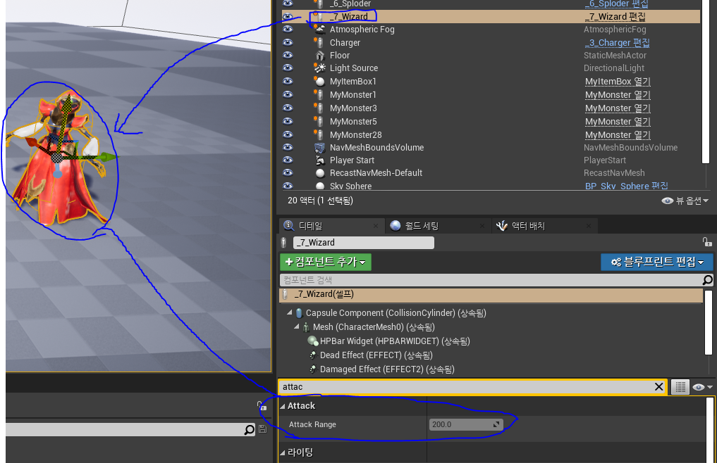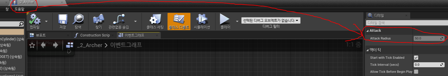 이번엔 블루프린트 안으로 들어가서 확인해보았다. 마찬가지로 Attack Range 변수는 VisibleInstanceOnly 로 지정자를 변경했기 때문에 블루프린트의 디테일 패널에 나타나지 않는다.