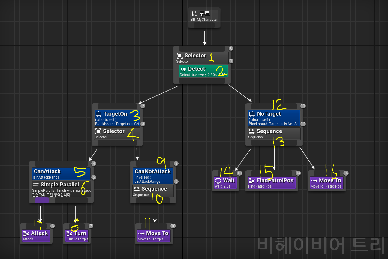 - 만약 타겟이 없다면 기다리고 다음 순찰 장소를 탐색하고 그 장소로 이동하는 시퀀스를 수행한다.